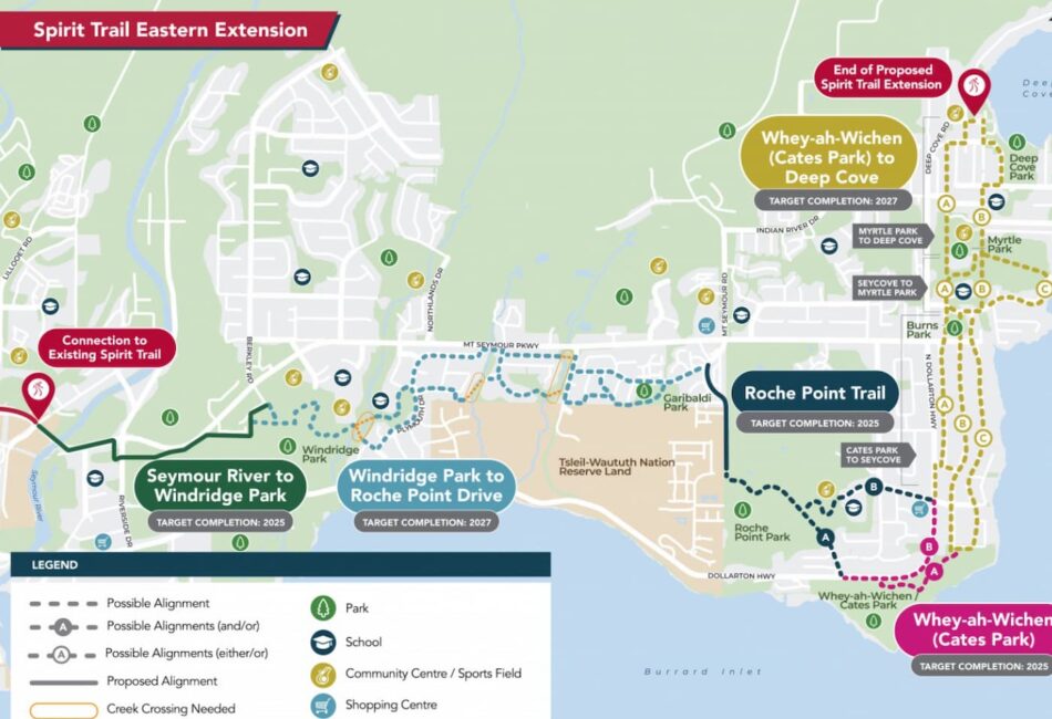 Planning is underway on an eastern extension of the Spirit Trail, which will key destinations and neighbourhoods east of the Seymour River. District of North Vancouver council approved a five-year Capital Plan in April last year, including $20 million to continue building the Spirit Trail.