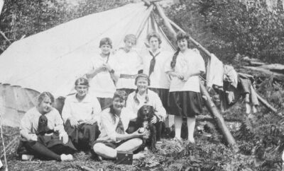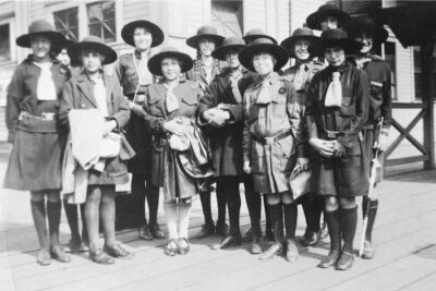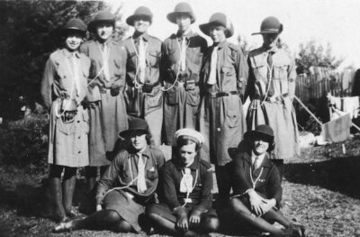 September marked 100 years since the first Girl Guide company opened in West Vancouver, led by a teacher at Hollyburn School. True – but in fact we had a Girl Guide here in West Van even before that. Dorothy Harris, the daughter of the light keeper at the Capilano Light Station was so keen to continue Guiding after the family moved from Vancouver to the mouth of the Capilano River that her father rowed her across to Stanley Park once a week and she walked to the meetings on Burrard St. An early photo shows Dorothy and sister Guides camping, in middy blouses and bloomers, at Gower Point, on the Sunshine Coast in 1916.