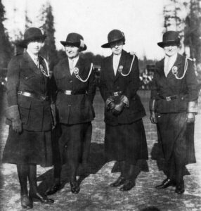 The company that opened in September 1921 saw enrolment reach 40 girls by Christmas and soon a second company opened, followed closely by a Brownie Pack for younger girls. Back then many walked through forest to get to meetings. One Guide company met in the basement of St. Stephen’s Church hall with its dirt floor and wooden benches along the walls. They did ladylike activities like putting on tea parties, always with ‘entertainment’, to raise money to run their companies – but they also hiked up the local mountains. Once, having walked from St. Stephen’s to Cypress Creek and up the mountain, they stayed out too long cooking their dinner over an open fire, and made their way home in the dark by crawling down a logging flume to the beach at West Bay and walking home along the coast.