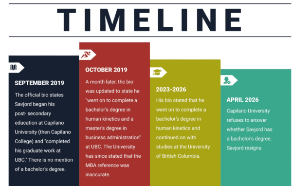 Archived records show that in September 2019, Savjord’s bio stated he began his post-secondary education at Capilano and “completed his graduate work at UBC.” The record in September made no mention of a completed bachelor’s degree. Thirty-four days later, in October 2019, the biography was updated to claim Savjord “went on to complete a bachelor’s degree in human kinetics and a master’s degree in business administration (MBA)” at the University of British Columbia.