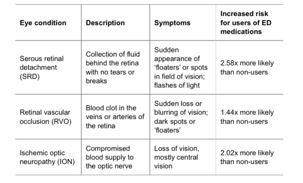 Two of the three conditions had previously been linked to ED medications only by anecdotal case studies. Those links are now confirmed for the first time by a large, epidemiological study, published today in JAMA Ophthalmology.