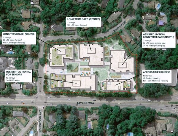The development permit application for the Inglewood site is built around the notion of creating a new overall “campus of care” with affordable seniors’ housing added to the mix in subsequent phases along with more LTC beds. New, affordable housing for seniors in the Taylor Way Corridor is identified as a specific need according to West Vancouver’s Official Community Plan.