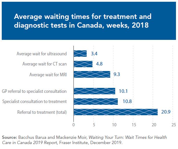 An average of 20.9 weeks pass between referral for a consultation and actual treatment, in addition to the original wait to see the family doctor (for those Canadians who have one!). In all, over one million Canadians – 3% of the entire population – are waiting for a medical treatment, sometimes for months on end.