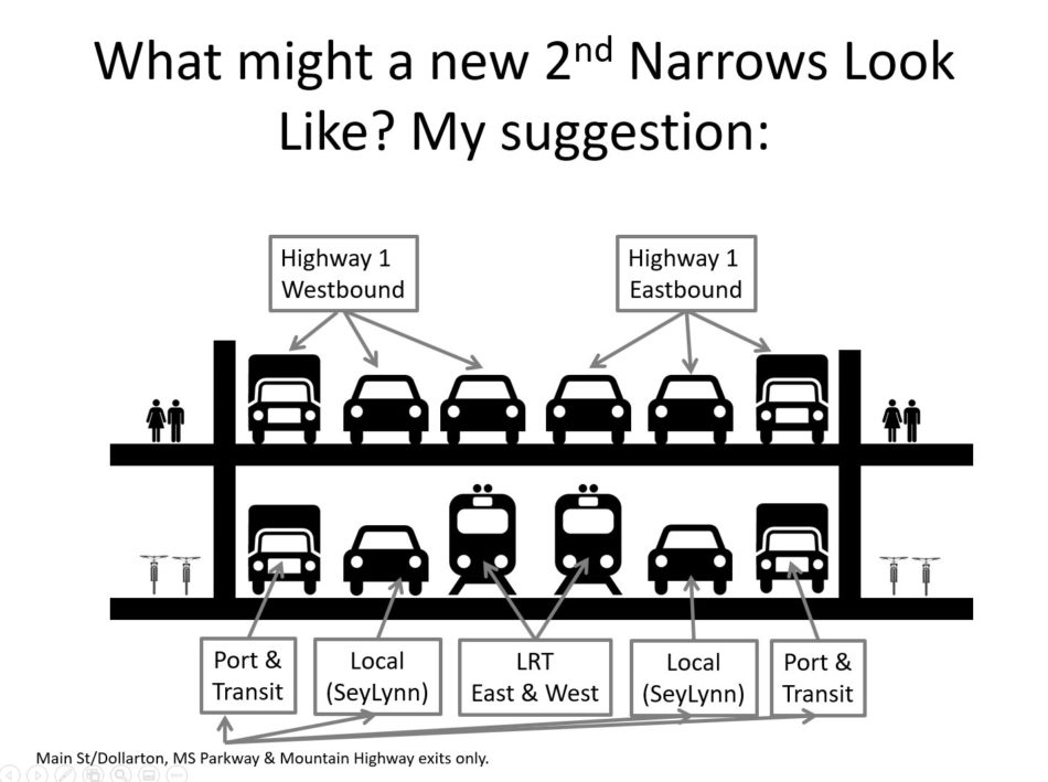 As such, I submitted to Council a concept of such a Second Narrows Bridge that I came up with — and I am sure when experts spend time they could do even better. This idea would be a two-deck, multi-lane bridge (similar to the Ship Canal Bridge that carries the I-5 into Downtown Seattle). On the top deck, we would see the “through traffic” for Highway 1 which would include exits West of Mountain Highway. On the lower deck, LRT, Port traffic and local traffic for Main Street, Dollarton, Mount Seymour Parkway and Lynn Creek.